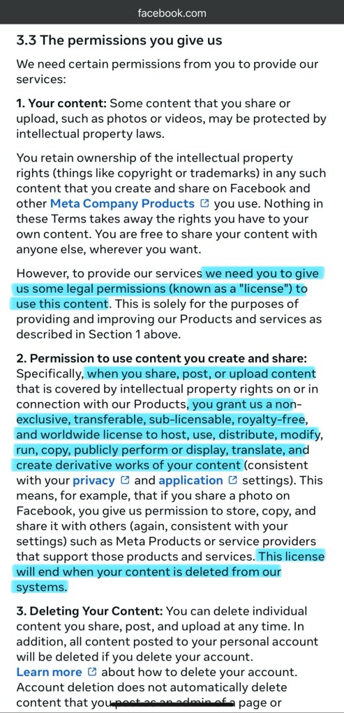 They truly believe that everyone will agree to these terms and go about their business as usual. And they’re not entirely wrong— they’re merely preying on the complacency that users have had for their bs for years. The evidence that users have become so accustomed to the monopoly on connections with friends, family, and communities on Facebook/IG/Threads, that it becomes daunting to go elsewhere. Many people have countless posts and photos accumulated on their profiles over time; perhaps too many to want to delete.