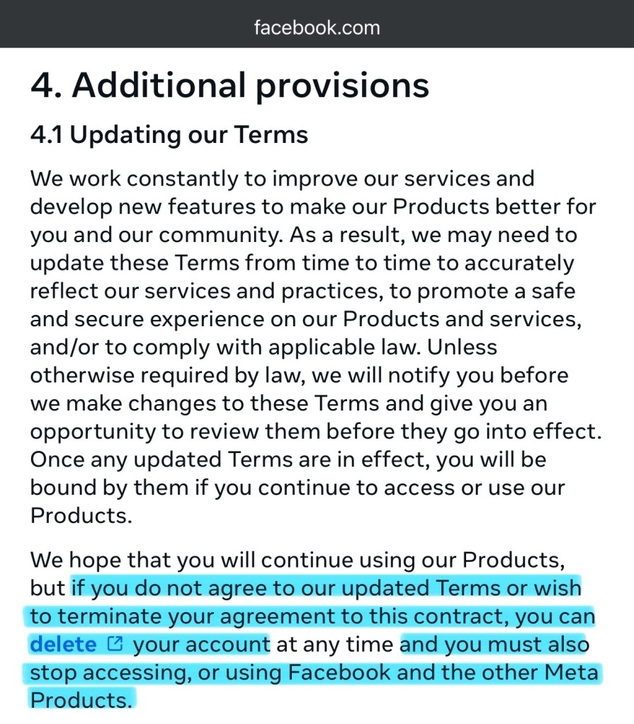 The cherry on top is that if you do not agree to the updated Terms, or you wish to terminate the agreement to this contract, they’re very emboldened to tell you to GTFOH. That means ALL Meta apps/products.